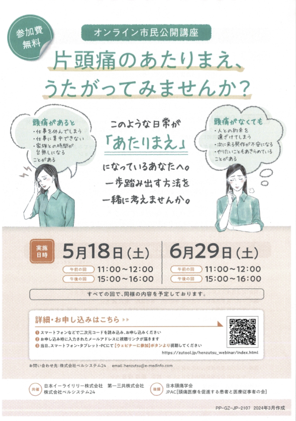 令和6年5月18日(土)と6月29日(土)に片頭痛のオンライン市民公開講座が開催されます。