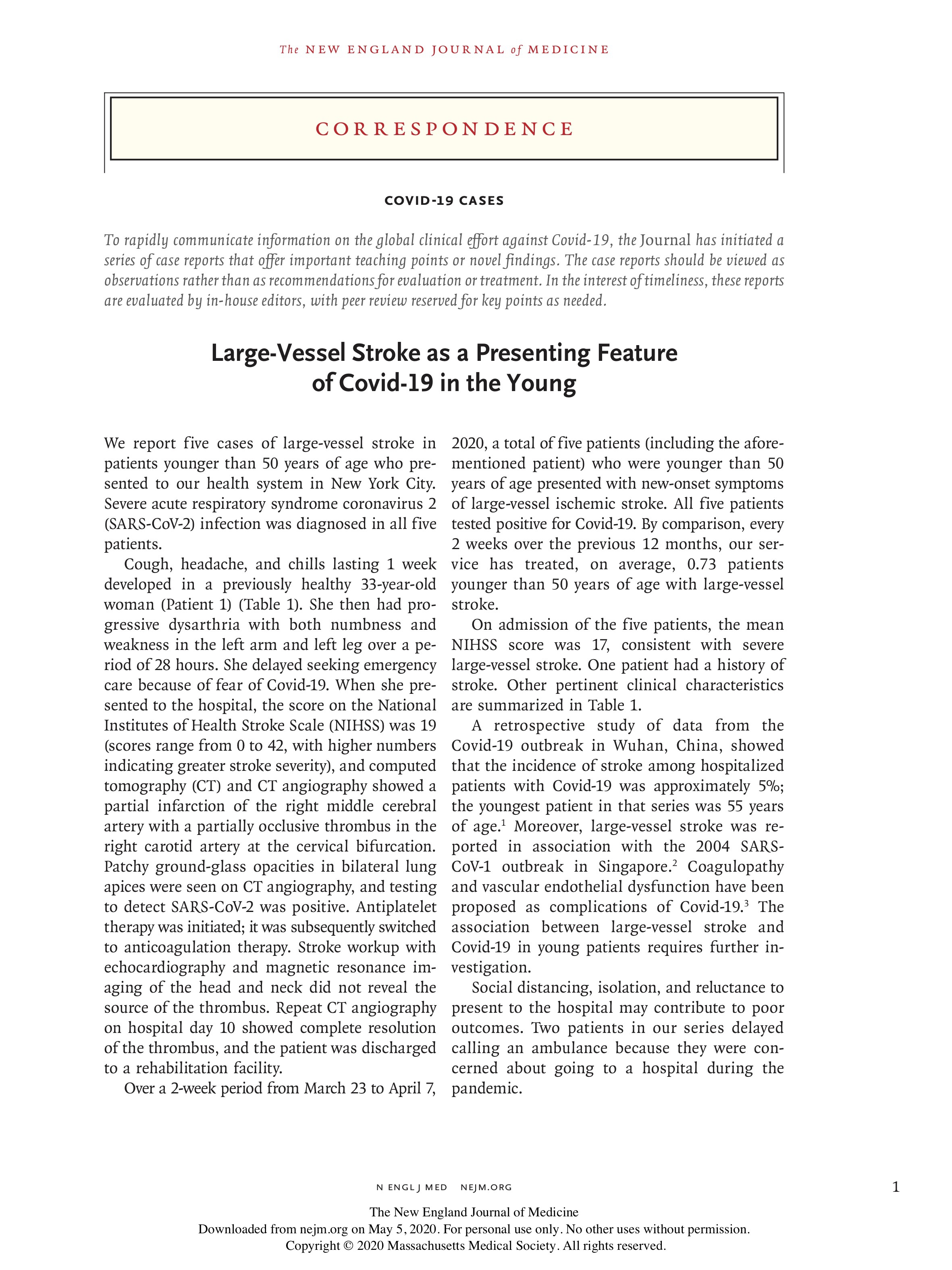 その中で、「新型コロナウイルスによって脳卒中や脳腫瘍が発生すること は、今のところ無いとされています。」と記述しました。この記事の作成は4月20日に行ったものですが、その後4月28日に「The New England Journal of Medicine誌」より新型コロナウイルス 感染によって若年性脳梗塞の増加が指摘されました。このため、ここで補足をさせていただきます。